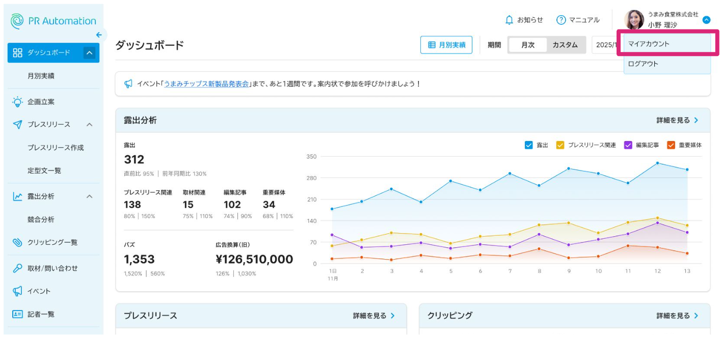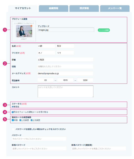 マイアカウントではご自身のアイコン、お名前や所属部署名、パスワードなどを変更できます。