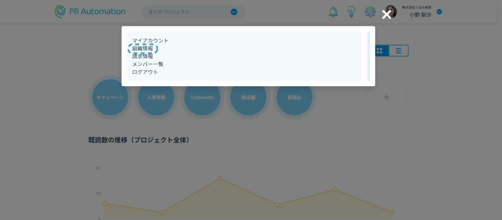 ログイン後の画面右上、アカウント欄をクリックし、「組織情報」を選択