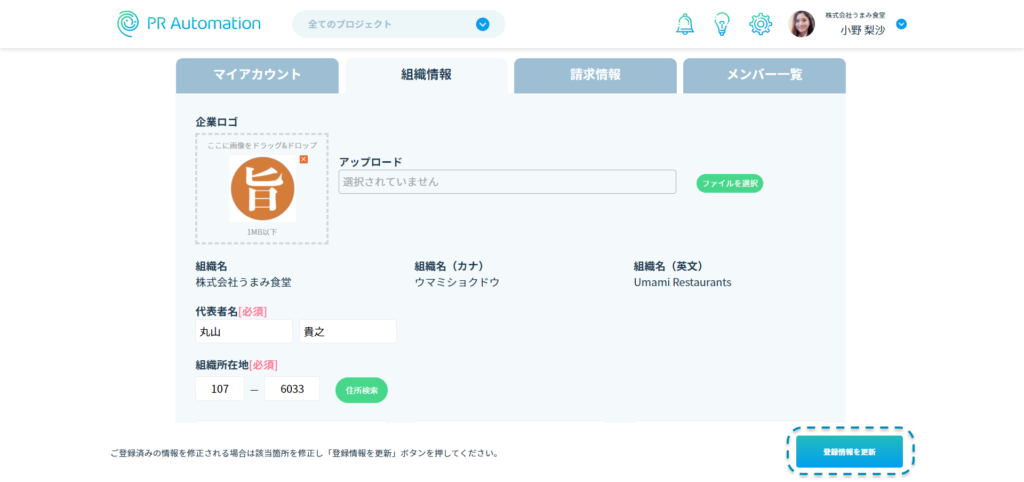組織情報ページでは、ご登録の自社情報の確認と変更ができます。