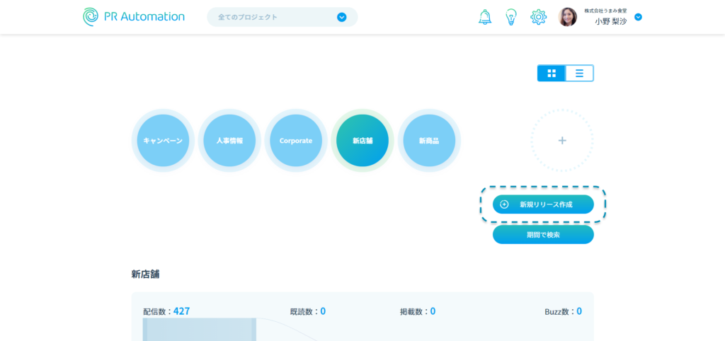ダッシュボード上のバナー内「プレスリリース一覧」をクリックし、「新規プロジェクトを作る」から新しくプロジェクトを作成します。