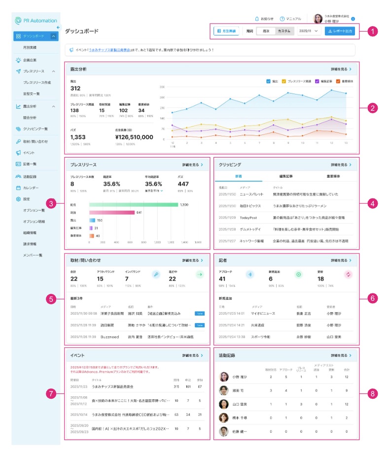 指定期間に配信したプレスリリース本数、既読率、バズ数、露出状況が確認できます。