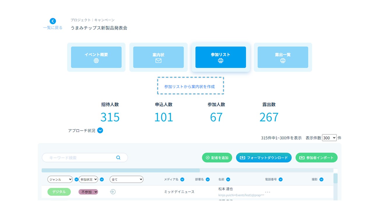 | 来場予定者 | 申込済みのメディアを抽出します。 前日のリマインドなどにご活用ください。 |