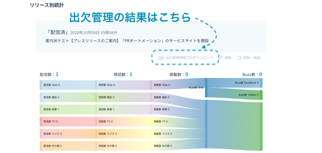 3.出欠管理フォームを使って配信したリリースのタイトル右下にある「出欠管理機能CSVダウンロード」をクリックします。