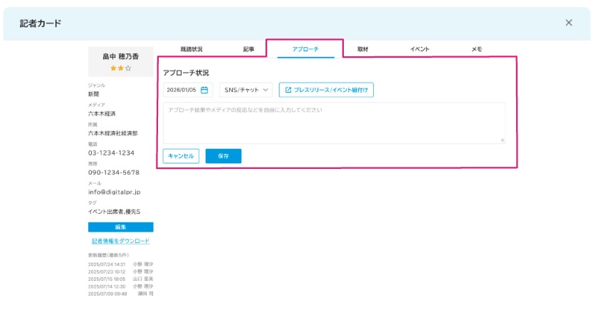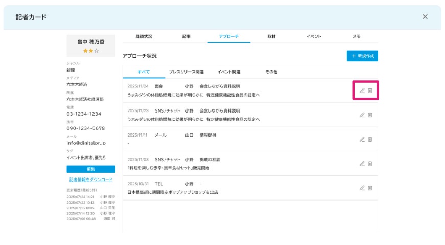 1.[記者一覧]からアプローチ履歴を追加したい記者を選択し、記者カードを開く