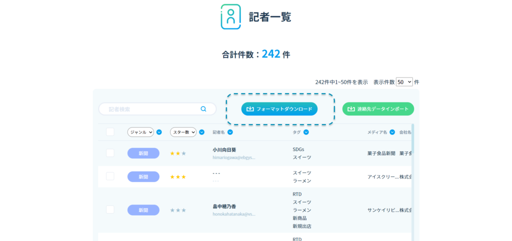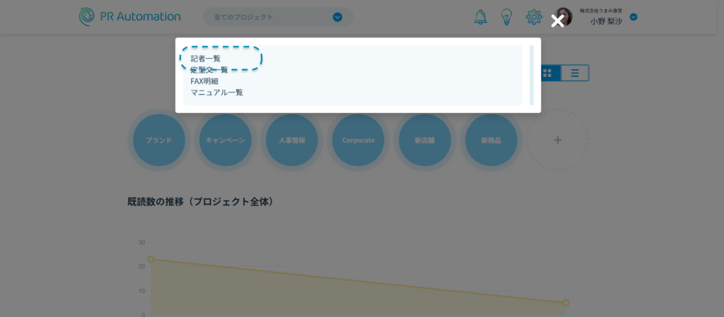 または画面上のヘッダー内「設定」ボタンからも記者一覧を開くことができます。