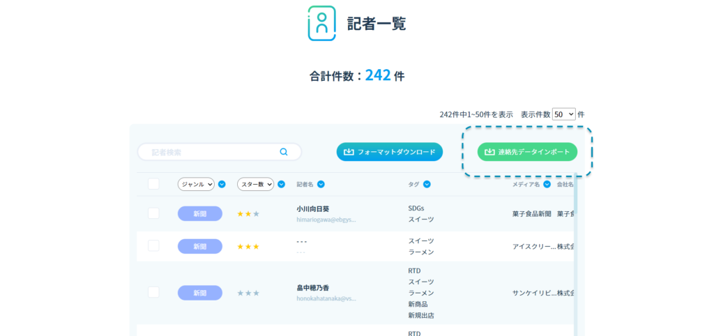 ※記者データのCSVを一度にインポートできる条件として以下がございます。件数やファイルサイズが大きい場合には、ファイルを分けてインポートください。