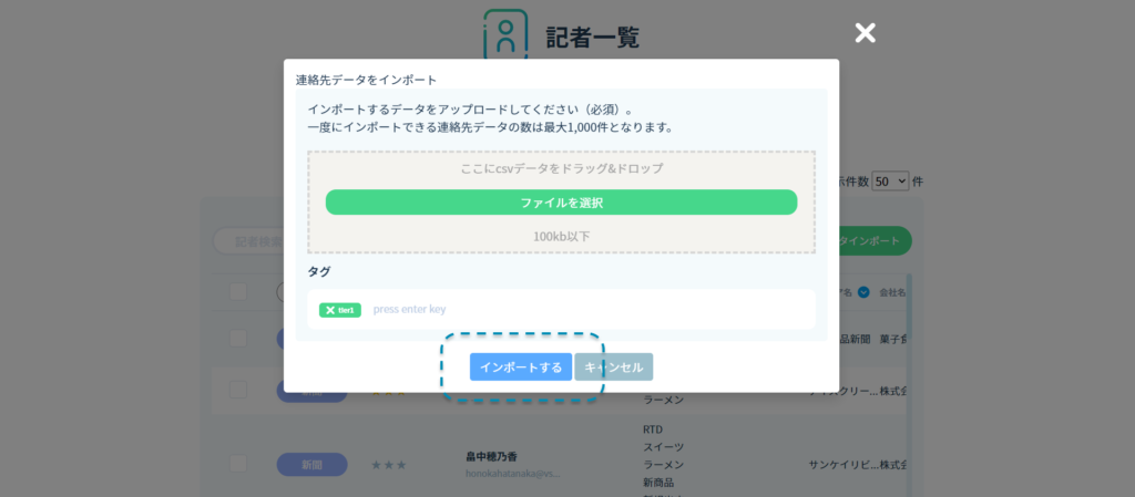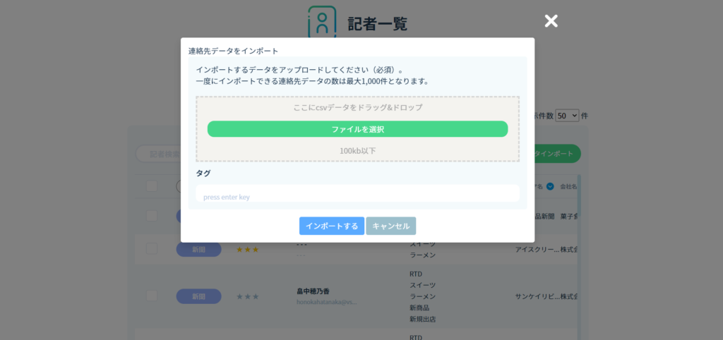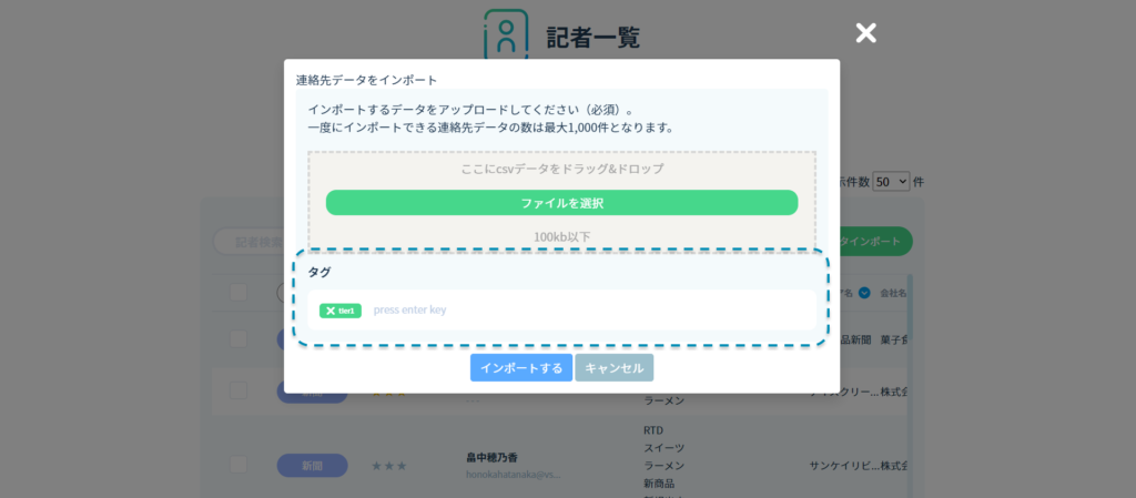 5.インポートするファイルをアップロードのうえ、記者タグの追加・上書きを選択してインポートします。