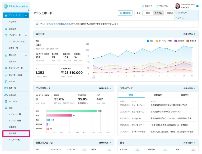 ご利用料金の請求先情報を確認できます。請求書送付先に記載のご担当者様宛に請求書を発行させていただきます。請求書送付先に変更がありましたら[請求情報]より変更ください。