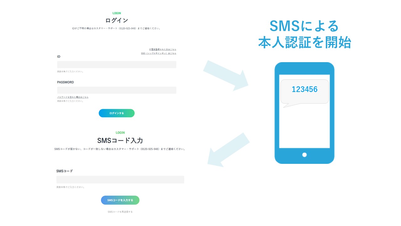 • セキュリティを強化するため、ログイン時のSMS(電話番号)認証を開始しました。